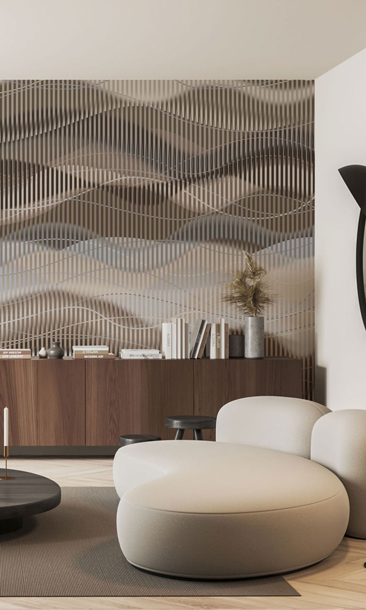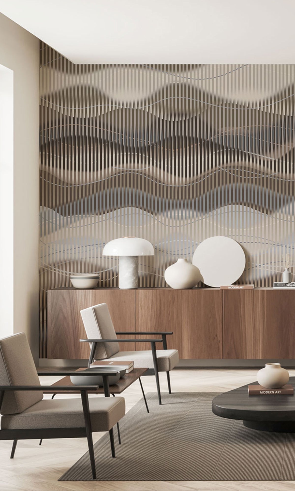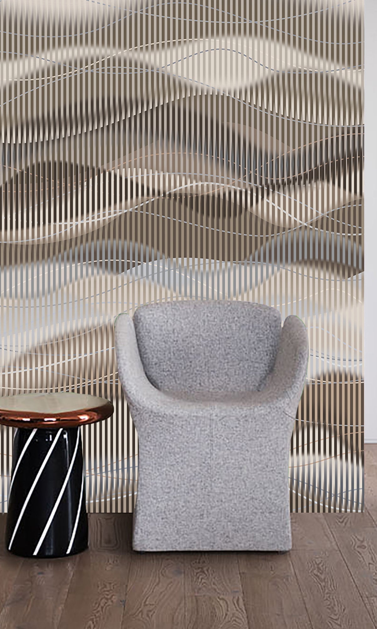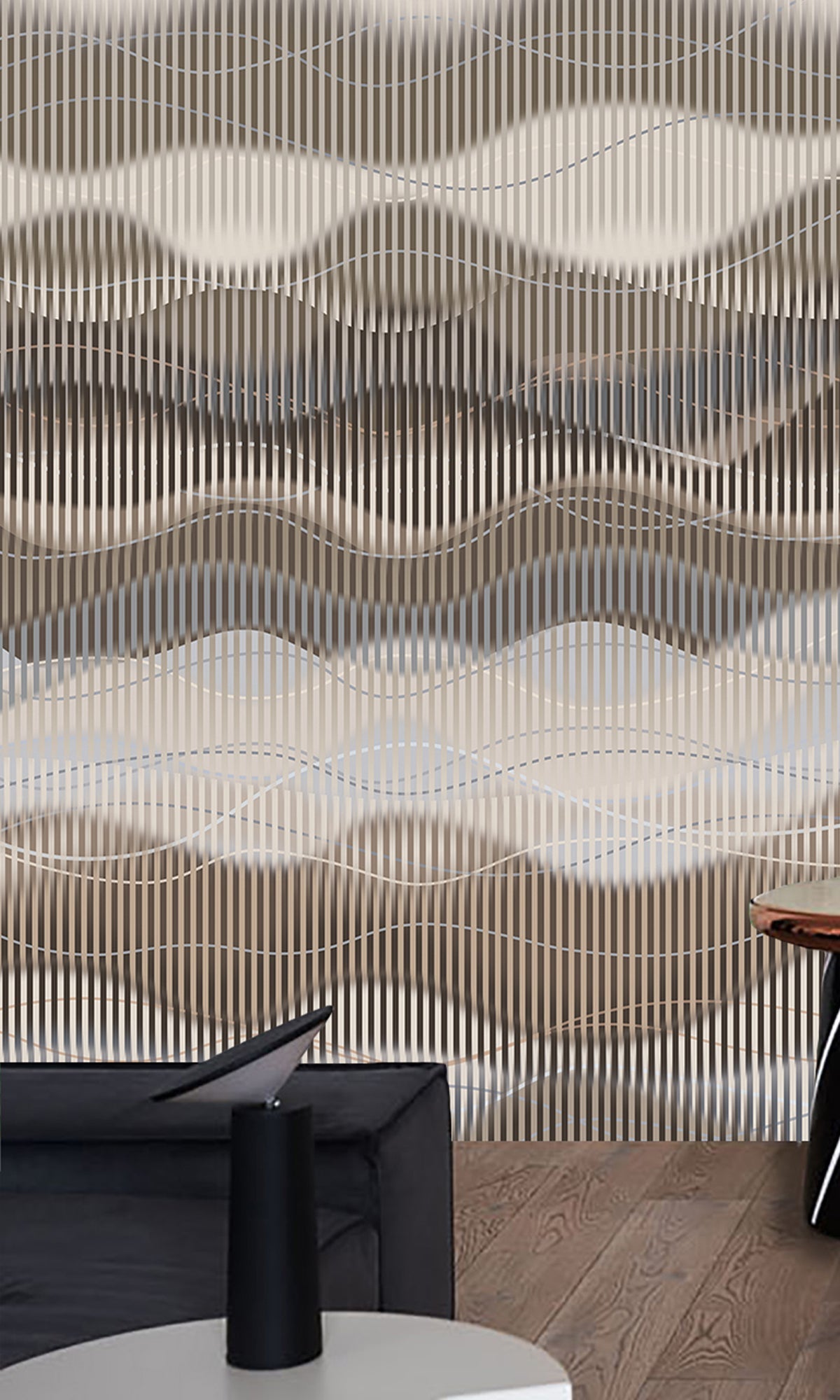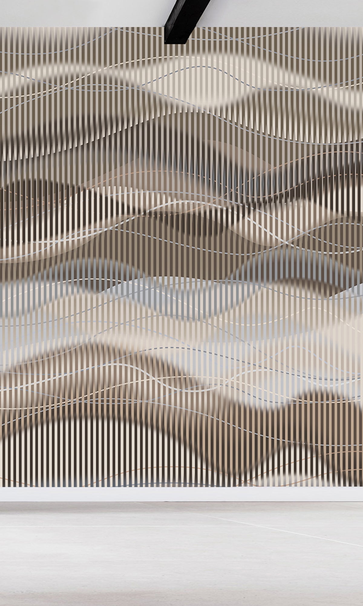 From our exclusive luxury collection of digital murals for high-end projects, this striking design introduces a sense of movement and openness to any space. Featuring fluid, overlapping waves set against a distorted stripe backdrop, it creates a captivating visual flow that adds both depth and dimension. perfect for making rooms feel more expansive and alive. Fully customizable and available in six premium materials, this mural offers a refined yet energetic statement tailored to suit your unique space and style.
