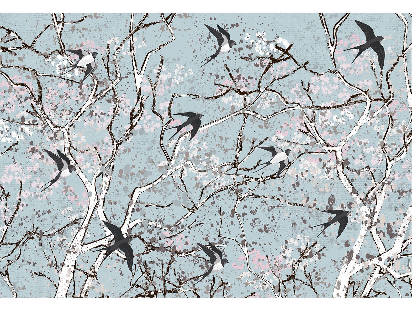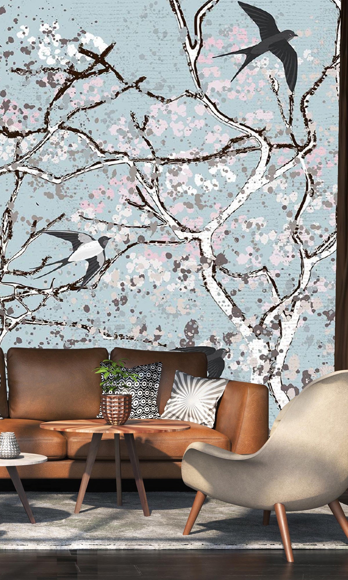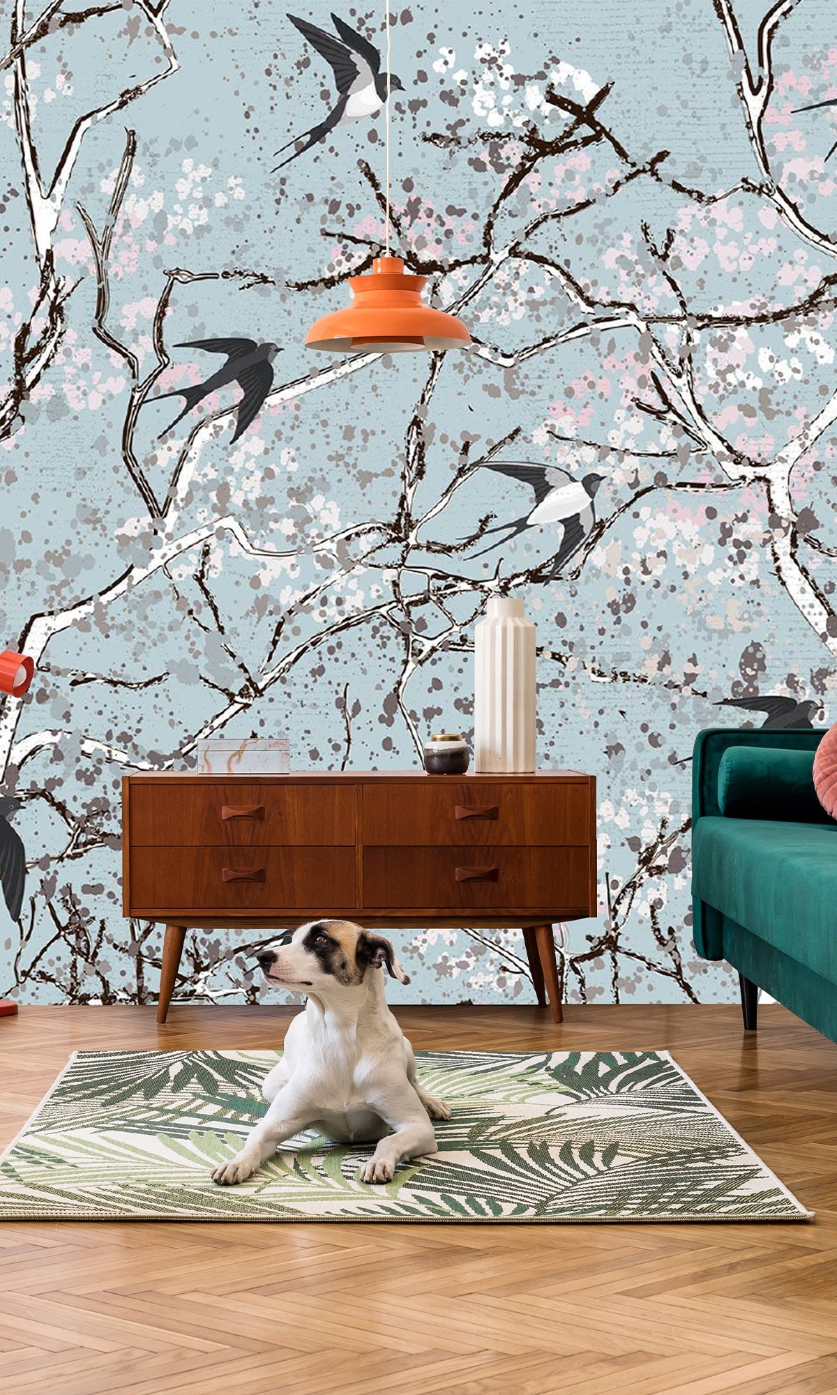 Instill a feeling of tranquility and soft liberation in your environment with this calm digital mural, showcasing a delicate arc of swallows settling amidst blossoming sakura trees. The gentle flowers and graceful flight of the birds generate a soothing, bright environment that enhances the ambiance of any space. Available in your selection of six high-quality materials and entirely adjustable to match your taste and environment, this unique mural serves as a lovely reminder of nature's serene moments and the happiness found in tranquility.