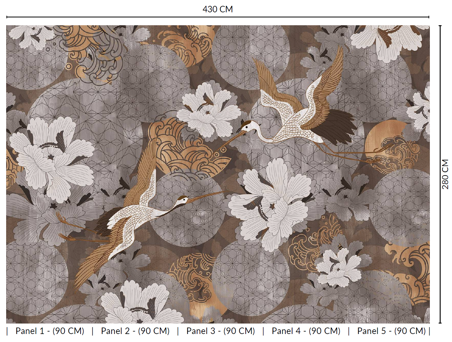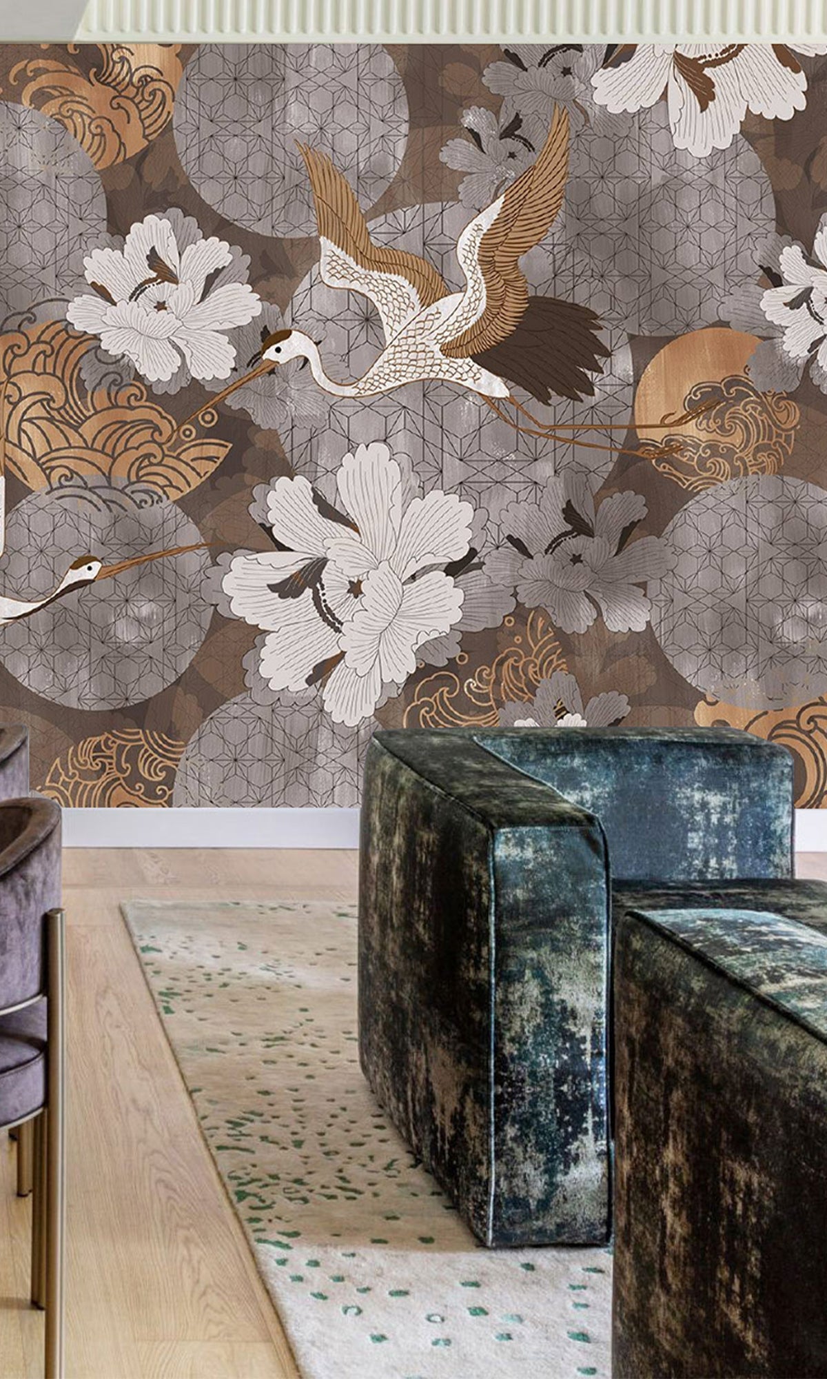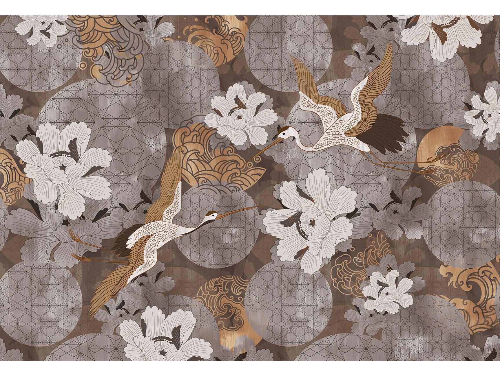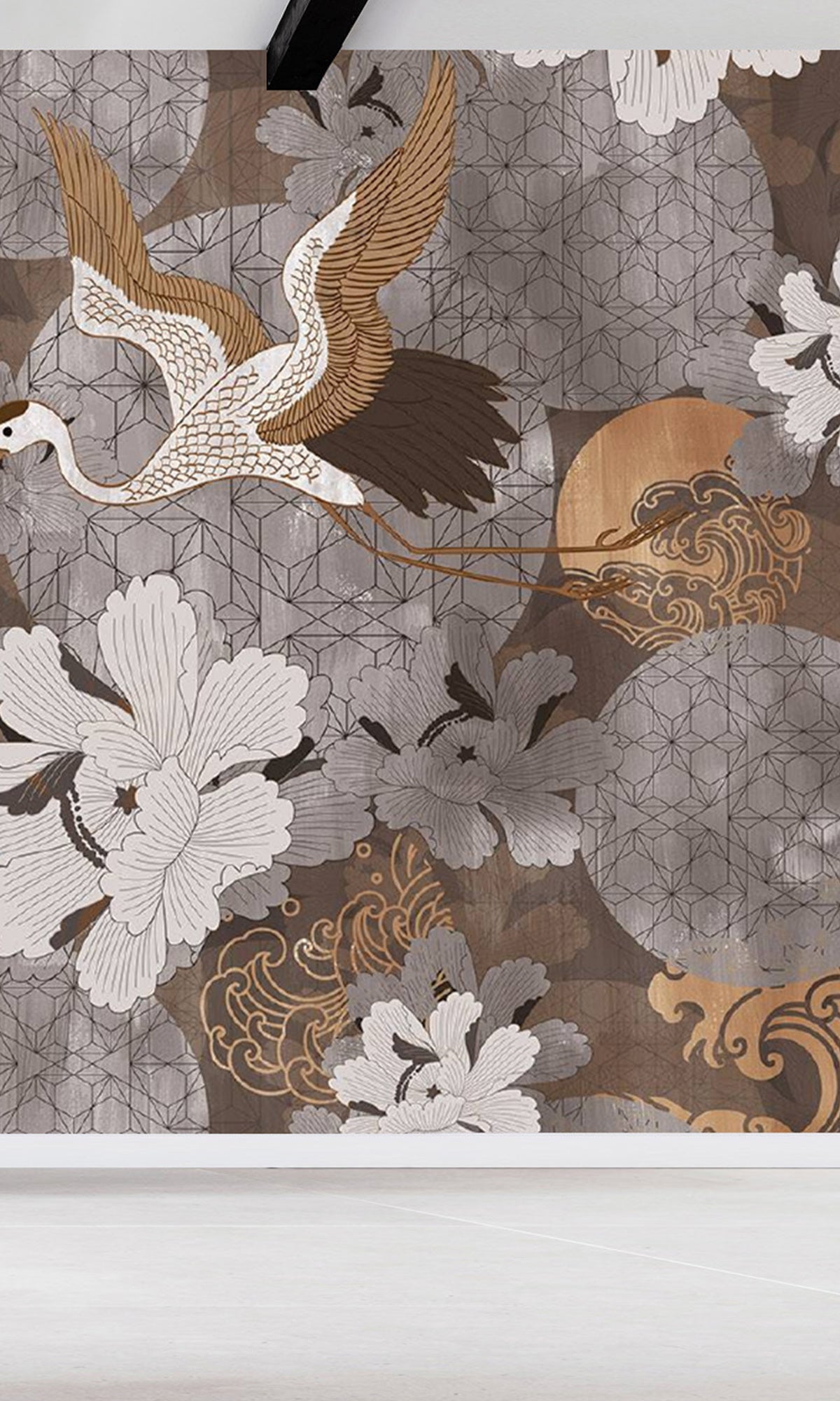 Add a sense of elegance and harmony to your environment with this exquisite digital mural, showcasing two cranes elegantly soaring towards one another amidst a stunning backdrop of florals and clouds inspired by Japanese art. The fragile natural components merge effortlessly with a modern geometric backdrop, establishing a distinct harmony of heritage and modern design. Available on six high-quality materials and entirely customizable to match your space and aesthetic, this unique mural brings a calm and artistic atmosphere to any area.