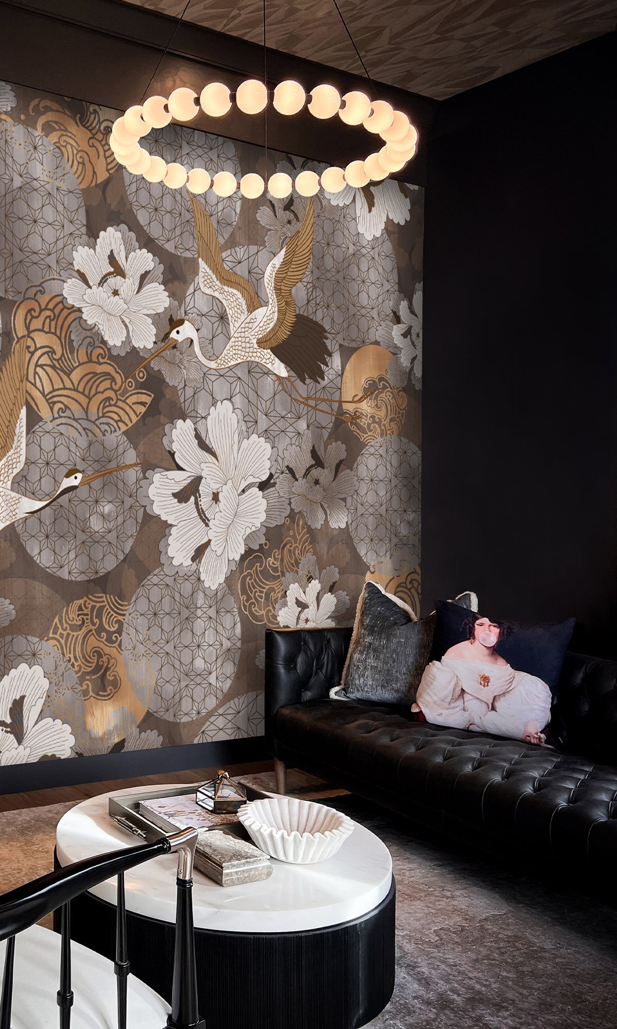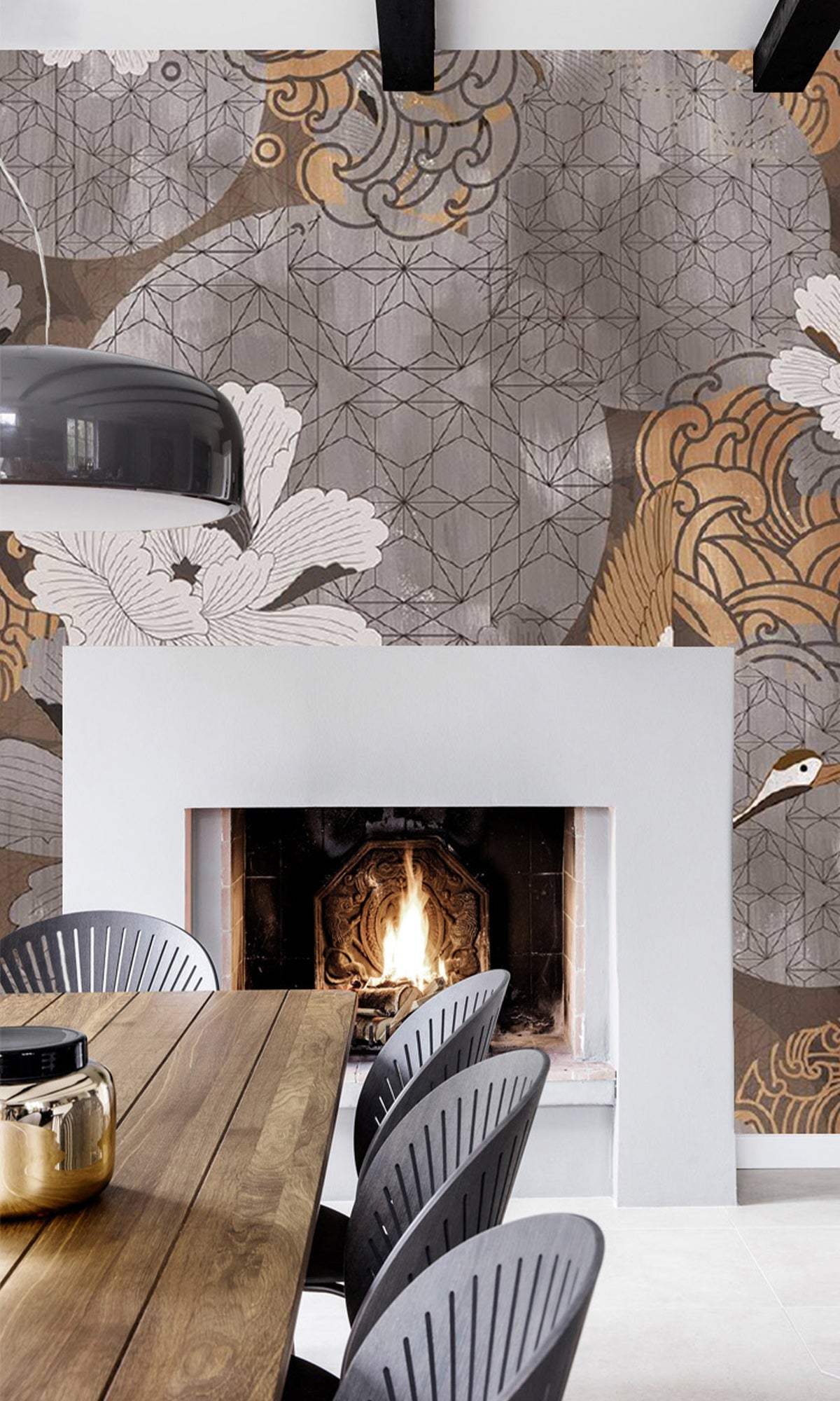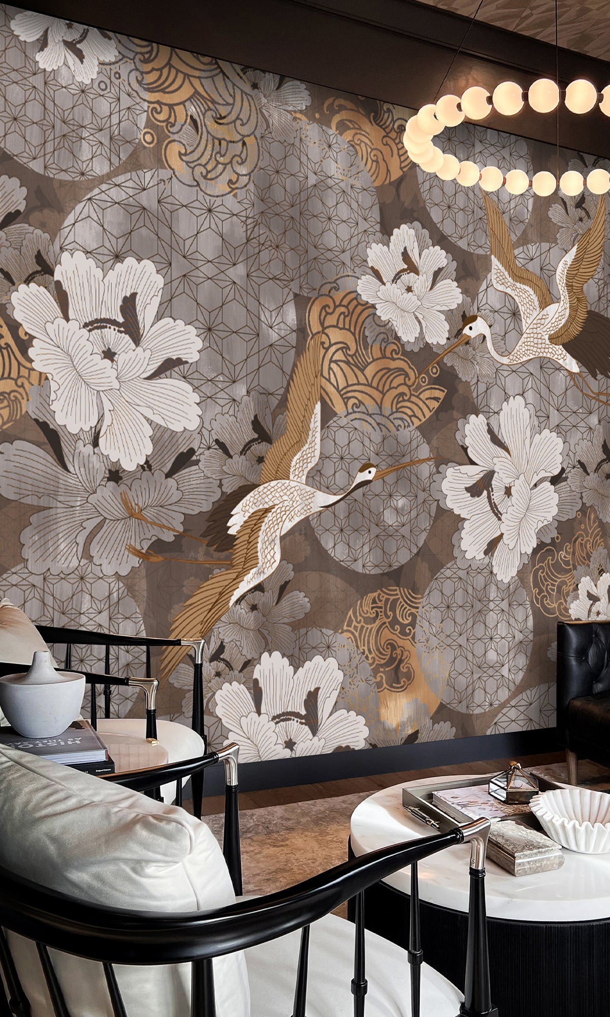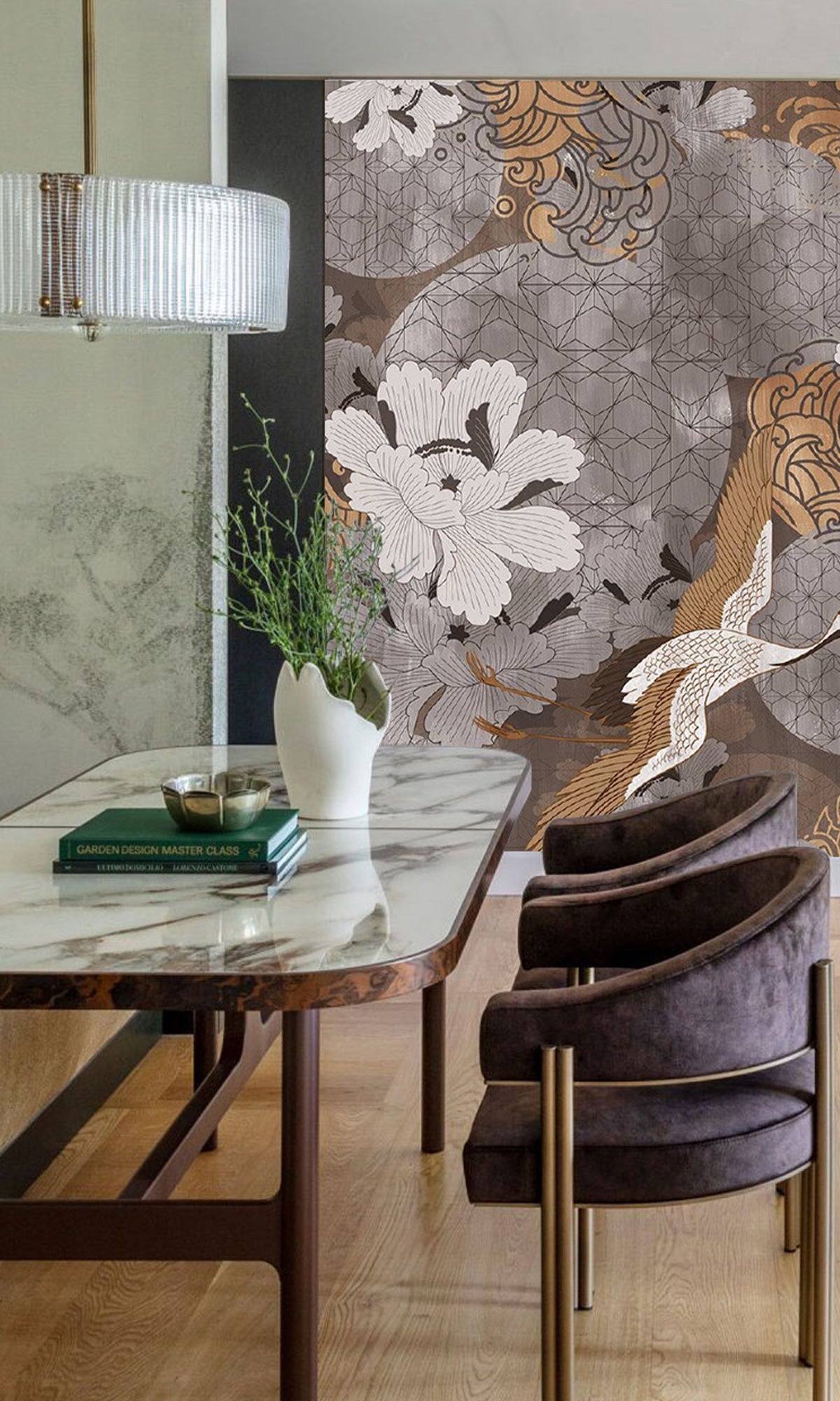 Add a sense of elegance and harmony to your environment with this exquisite digital mural, showcasing two cranes elegantly soaring towards one another amidst a stunning backdrop of florals and clouds inspired by Japanese art. The fragile natural components merge effortlessly with a modern geometric backdrop, establishing a distinct harmony of heritage and modern design. Available on six high-quality materials and entirely customizable to match your space and aesthetic, this unique mural brings a calm and artistic atmosphere to any area.