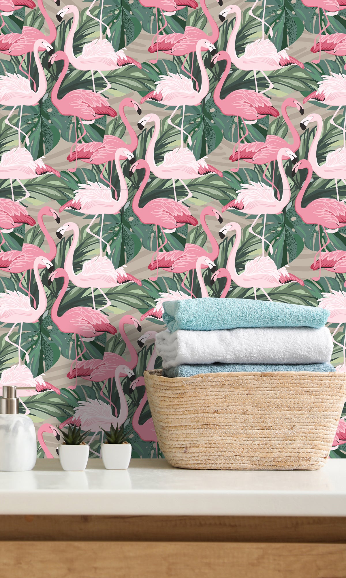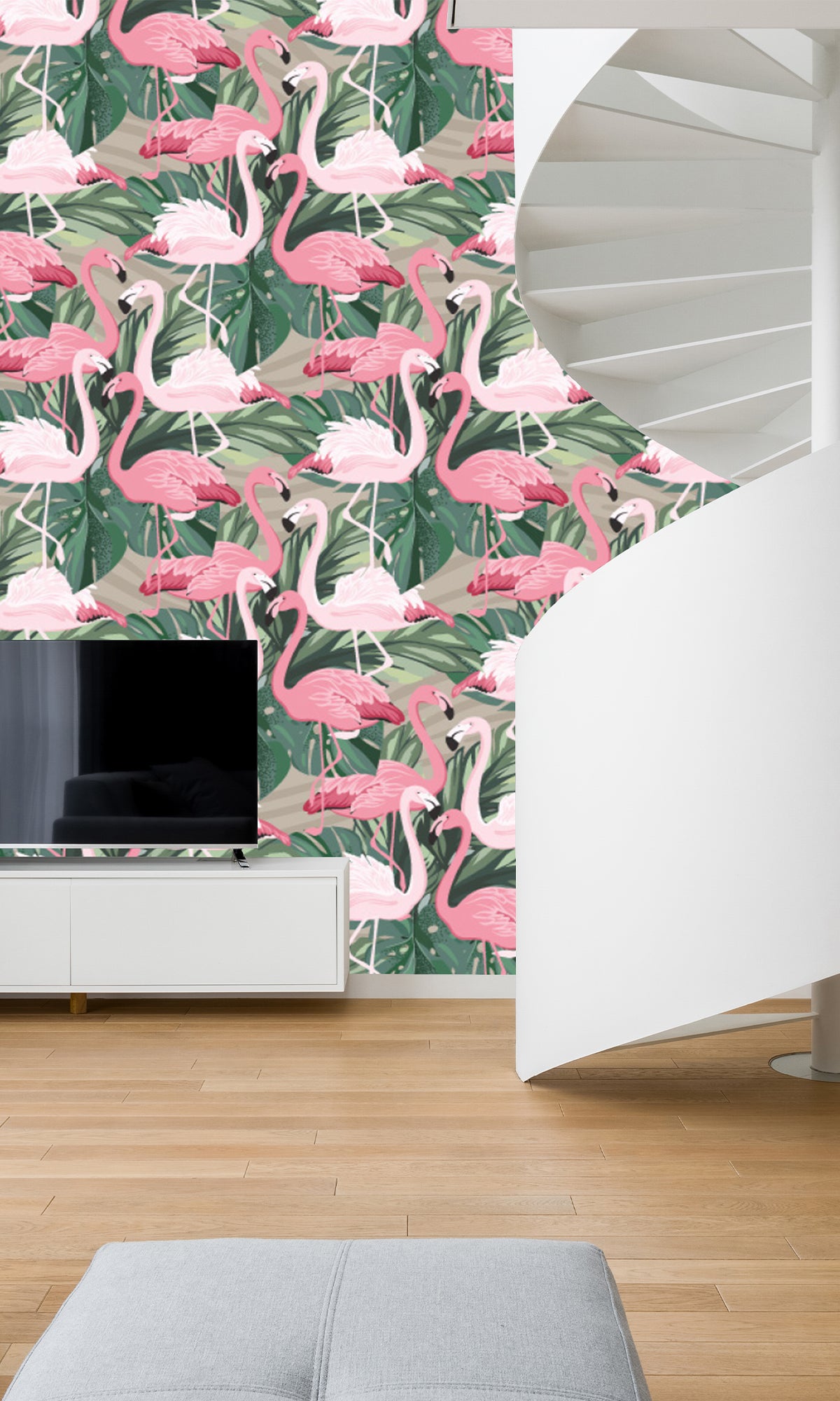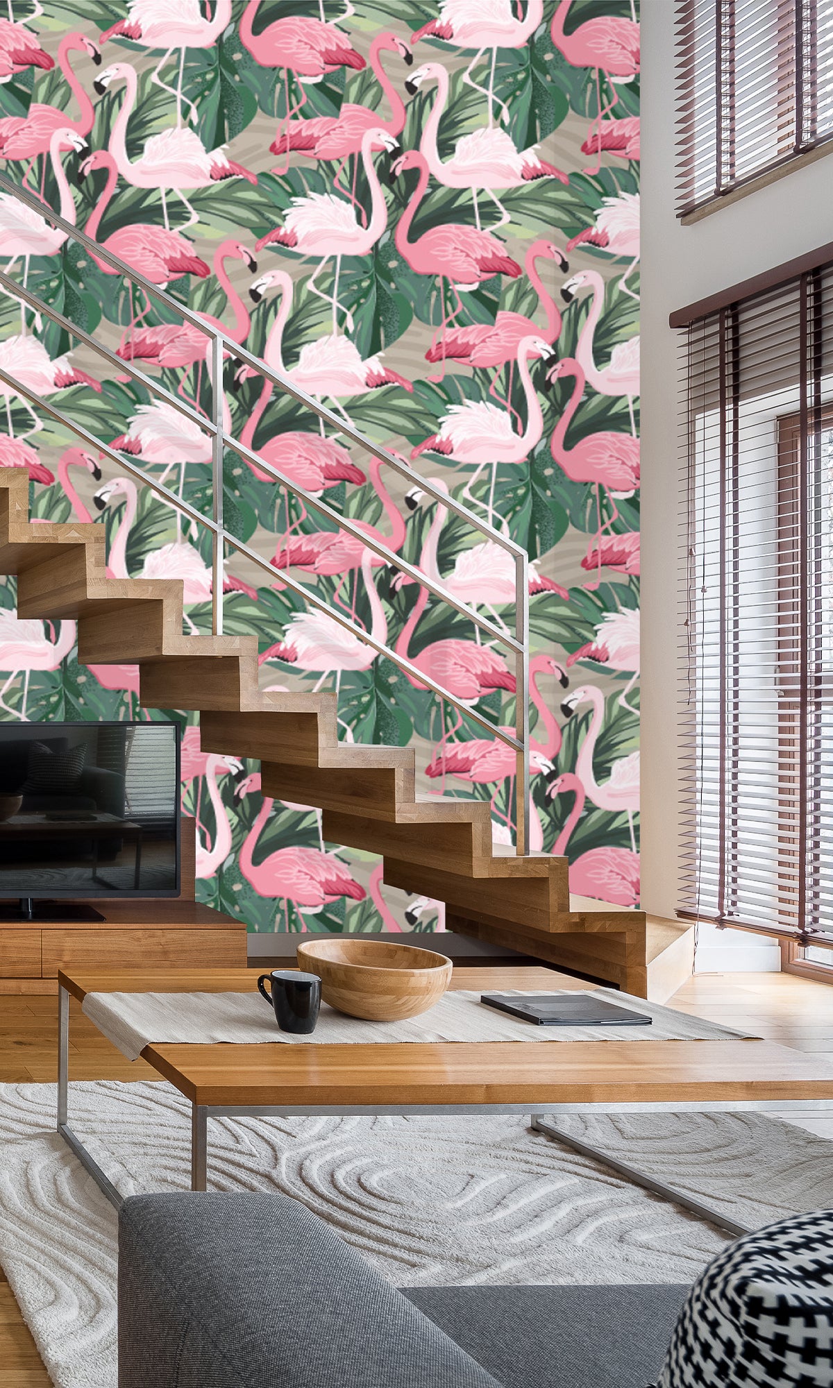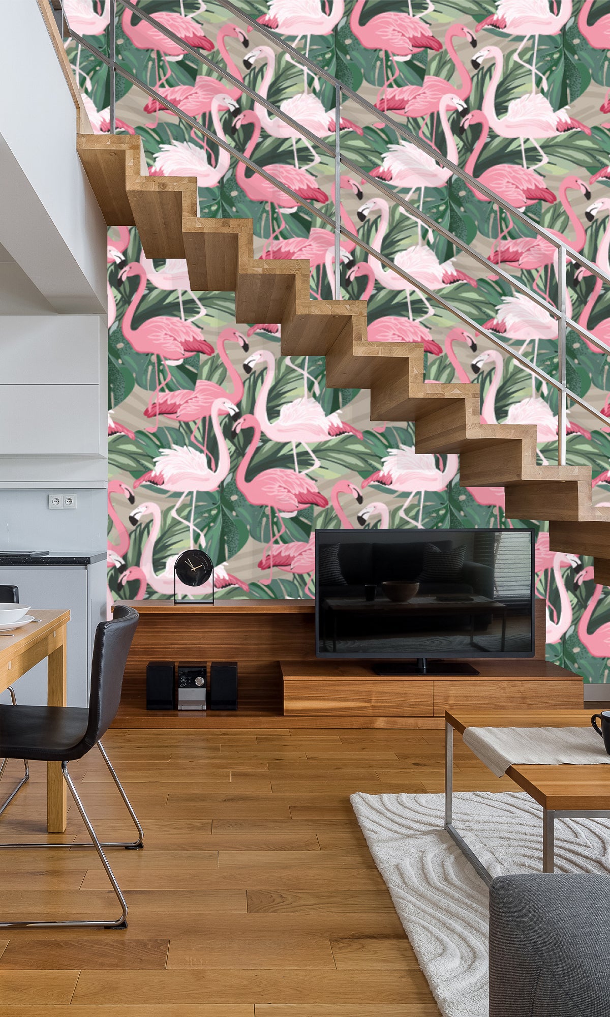 Dive into a tropical paradise with this stunning digital mural, where graceful white and pink pelicans frolic amidst a lush backdrop of vibrant palm leaves. This lively scene captures the carefree spirit of island life, infusing your space with warmth, energy, and a splash of exotic color. Perfect for bringing a fresh, sun-soaked vibe to any room, this mural transforms your walls into a tropical escape. Printed on six premium-quality materials and fully customizable to your taste, it's an exclusive way to invite the vibrant beauty of the tropics right into your home.