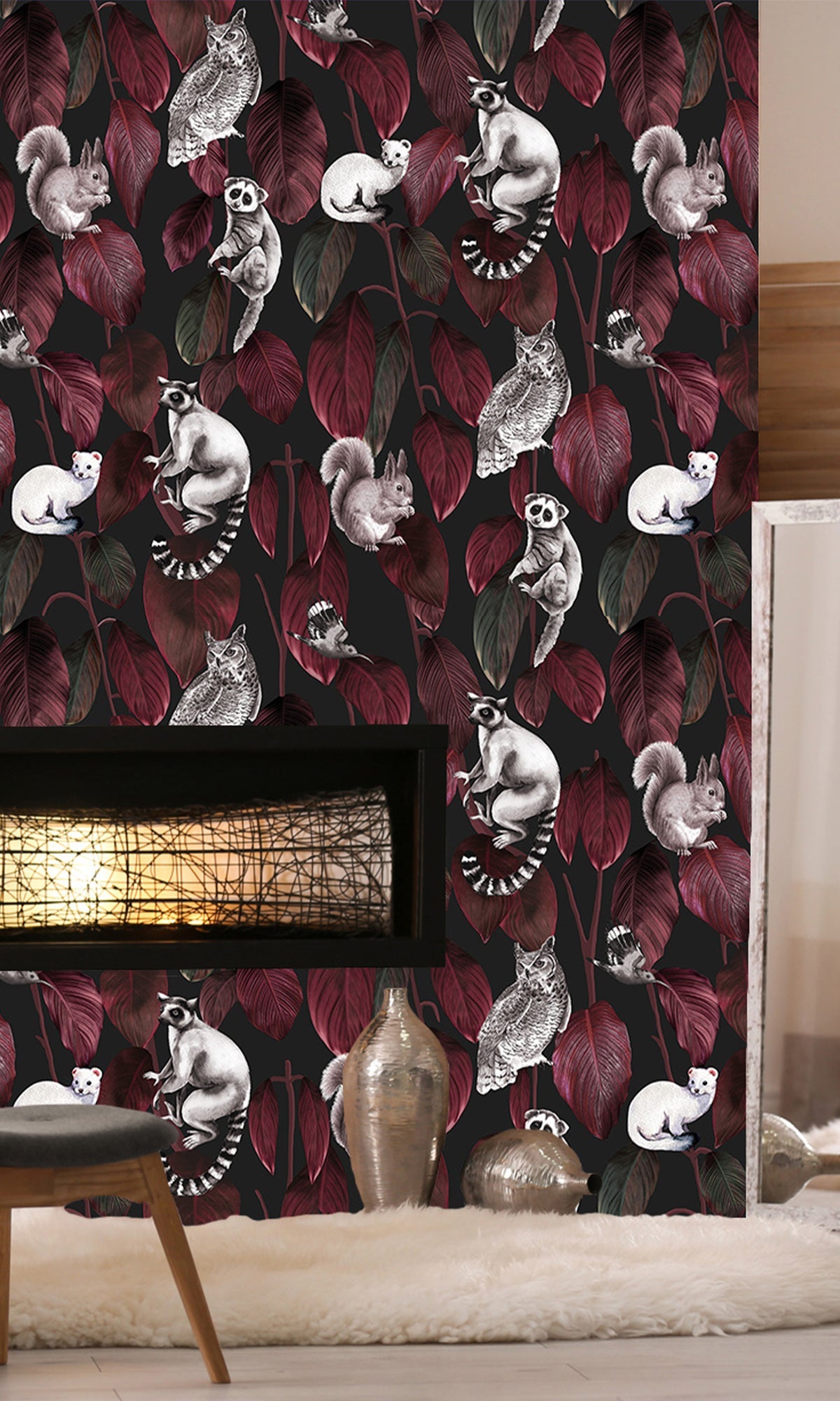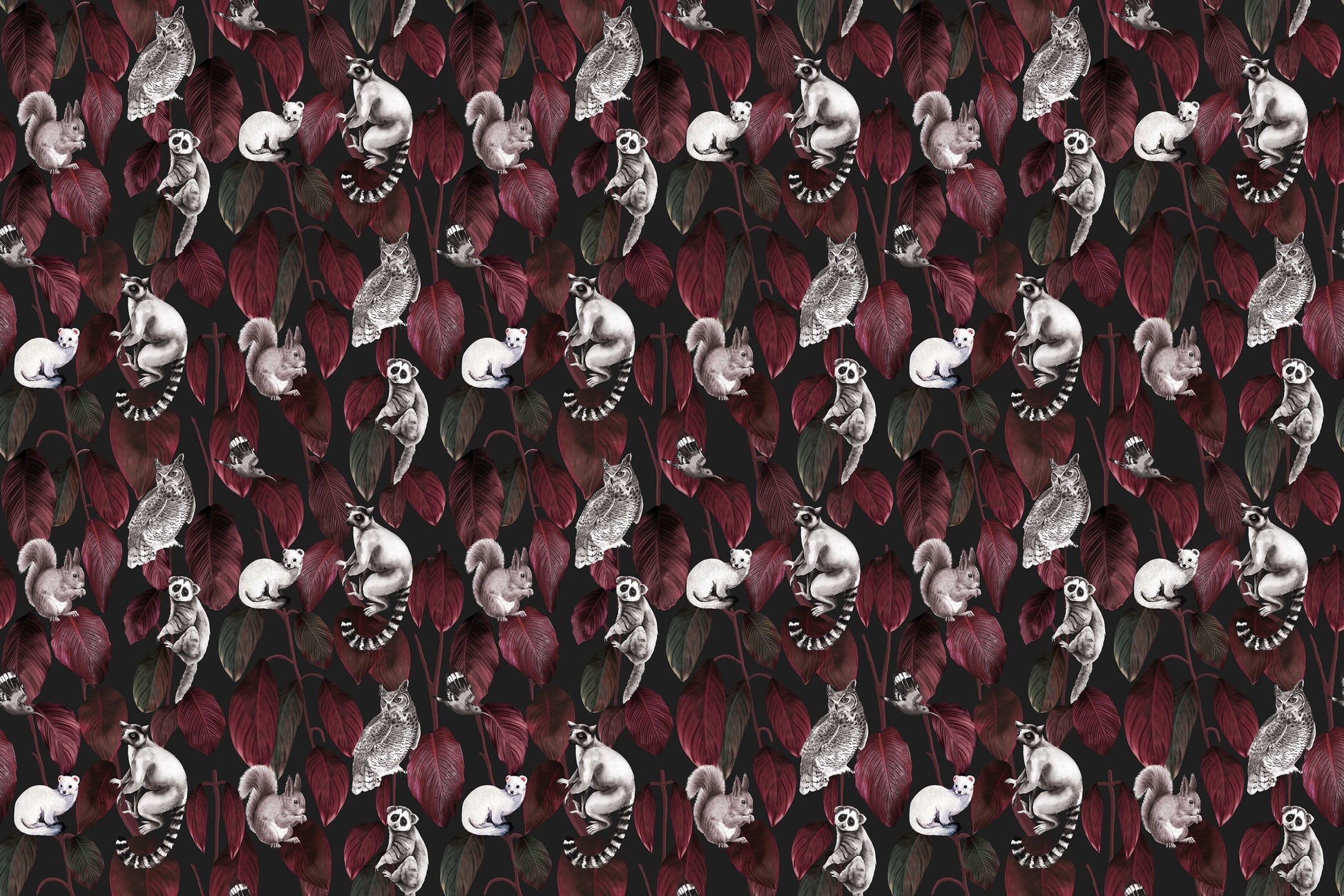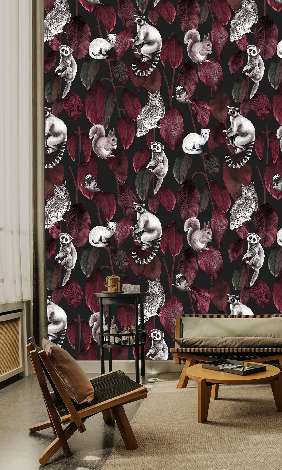 Welcome to the jungle after dark! A cheerful cast of nocturnal creatures peeks and perches playfully among a cascade of lush, oversized Ficus elastica leaves, reimagined through the eyes of an artist. With its vibrant colors and charming characters, this mural feels like a storybook scene frozen in time, full of personality, contrast, and unexpected delight. It's the perfect way to add a sense of wonder and lively charm to nurseries, playrooms, or any space that could use a little magic. Printed on your choice of six high-quality materials and fully customizable, this exclusive digital mural is ready to bring walls to life, one curious critter at a time.
