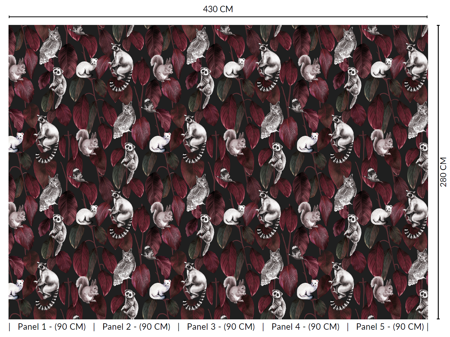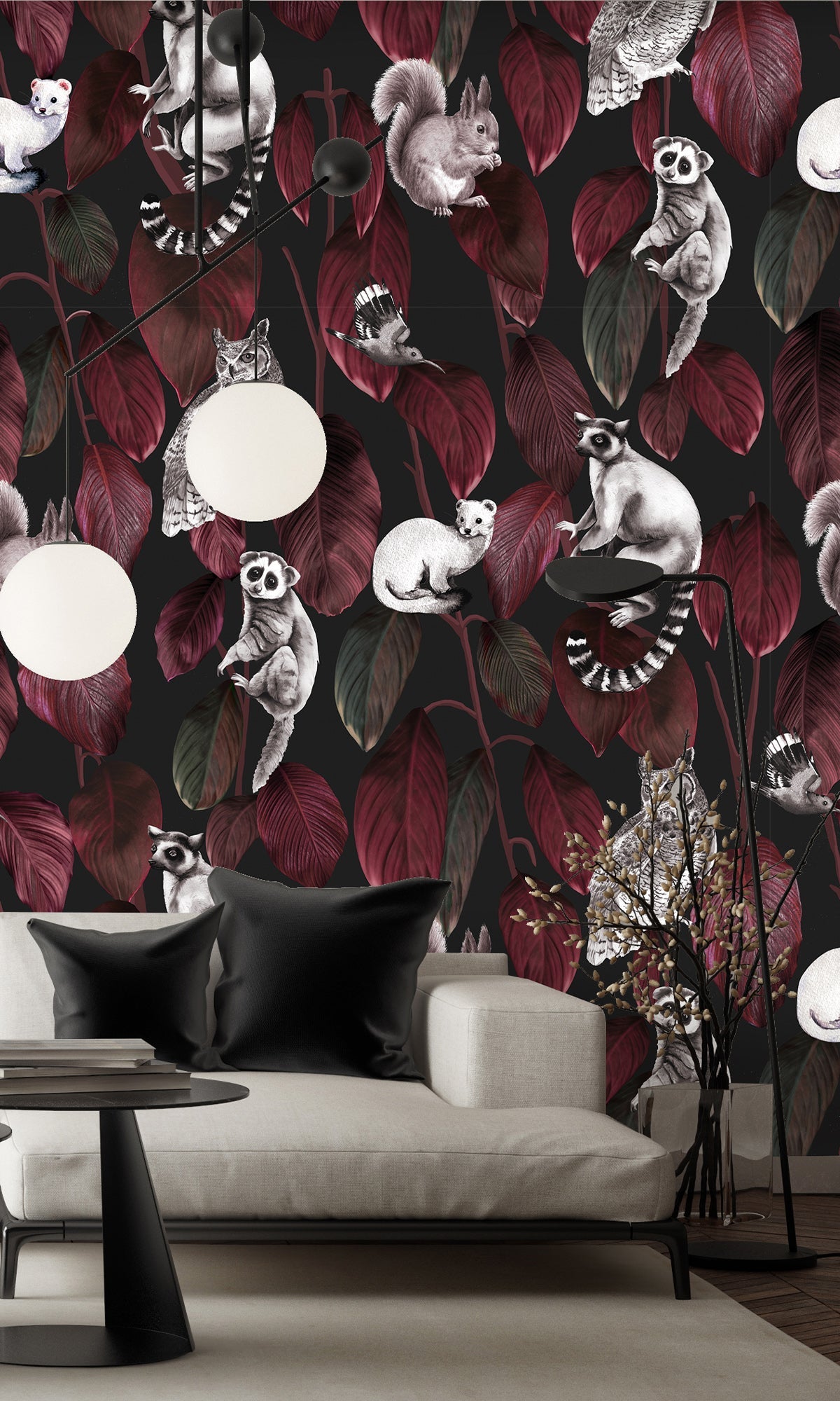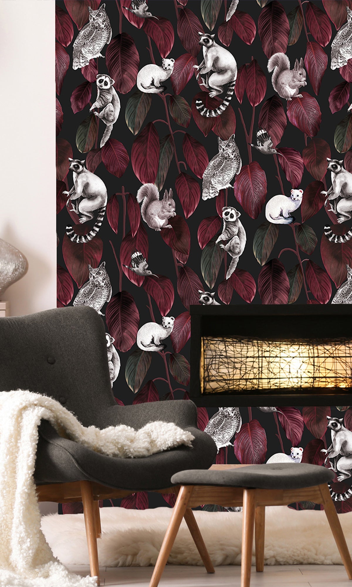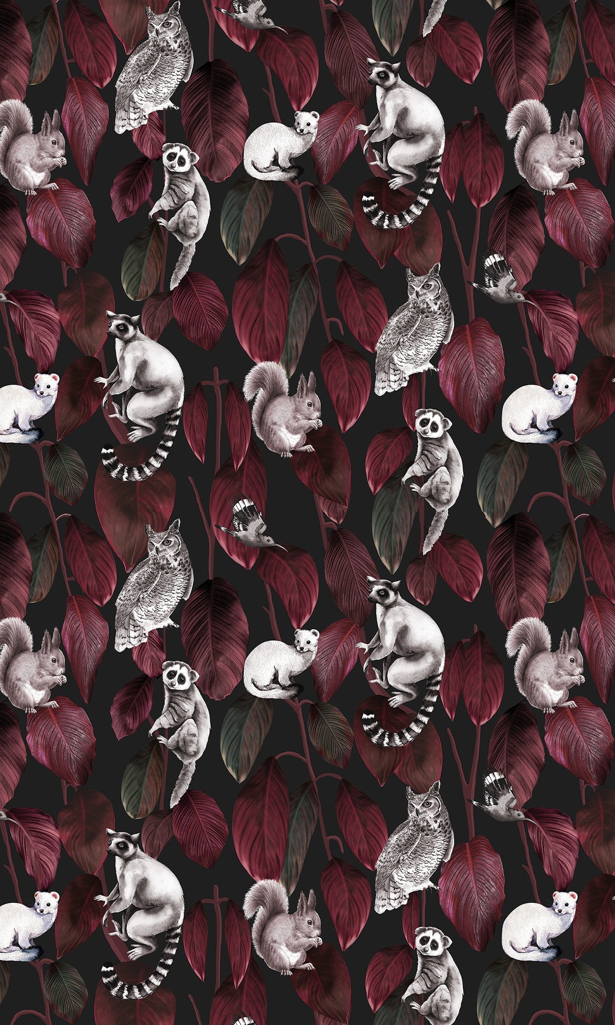 Welcome to the jungle after dark! A cheerful cast of nocturnal creatures peeks and perches playfully among a cascade of lush, oversized Ficus elastica leaves, reimagined through the eyes of an artist. With its vibrant colors and charming characters, this mural feels like a storybook scene frozen in time, full of personality, contrast, and unexpected delight. It's the perfect way to add a sense of wonder and lively charm to nurseries, playrooms, or any space that could use a little magic. Printed on your choice of six high-quality materials and fully customizable, this exclusive digital mural is ready to bring walls to life, one curious critter at a time.
